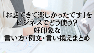 ビジネス 「お話できて楽しかったです」をビジネスでどう使う?好印象な言い方・例文・言い換えまとめ まず知っておきたい!「お話できて楽しかったです」の基本と意味「お話できて楽しかったです」という言葉は、相手との会話を心から楽しめた気持ちを伝える表現です。ビジネスの場でも使うことはできますが、シーンによっては言葉の選び方に少し注意が必要です... ビジネス